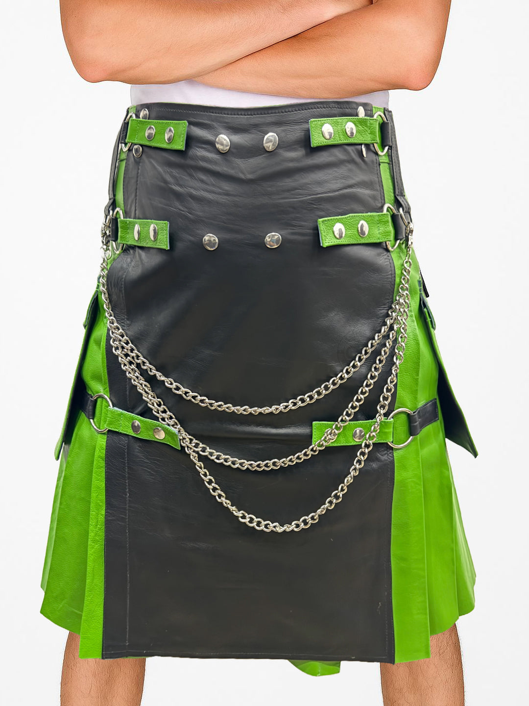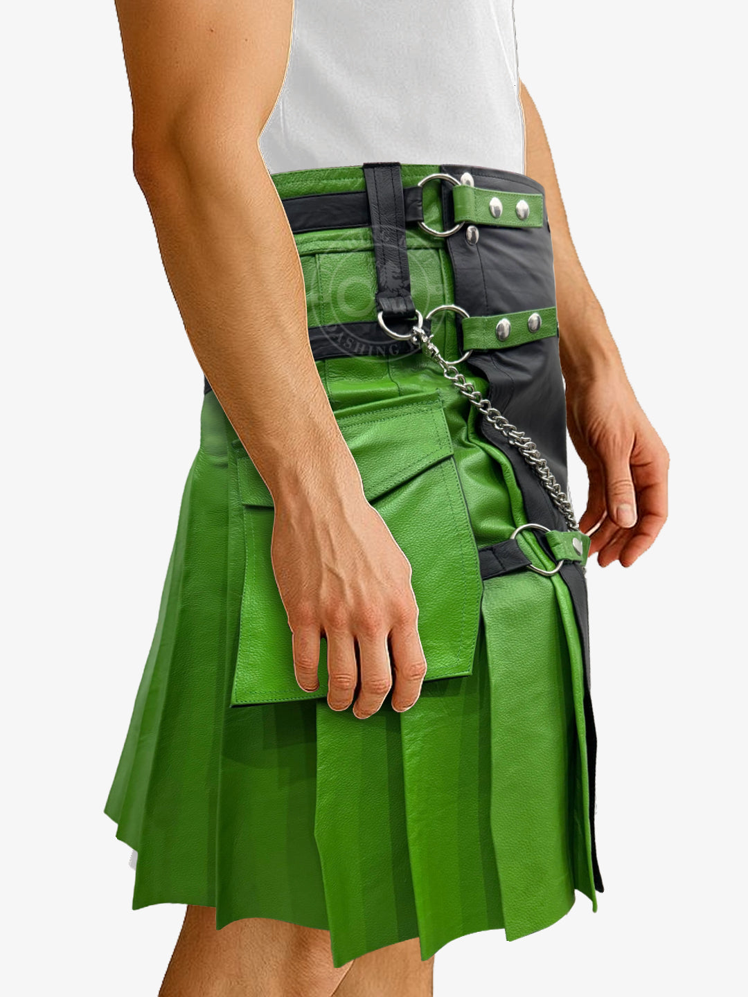 Black & Dark Green Men Leather Fashion Kilt are very popular in fashion now, your wish to buy this leather kilt . Get through the new styled trendy colorful kilt. This leather kilt is a fashionable men garment to make you standout in the crowd. Crafted from premium lambskin leather gives out dual shade red panels at side and black at the front and back. The front panels are detachable and you can make as many changes in the colors by changing this panel. This converting kilt will give you another look at an ease. This leather kilt is available in colors and all size and also features the studs and chain detailing.