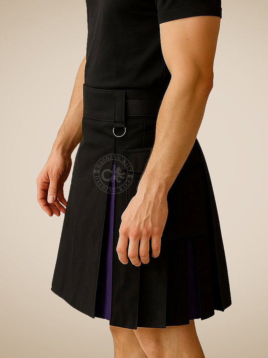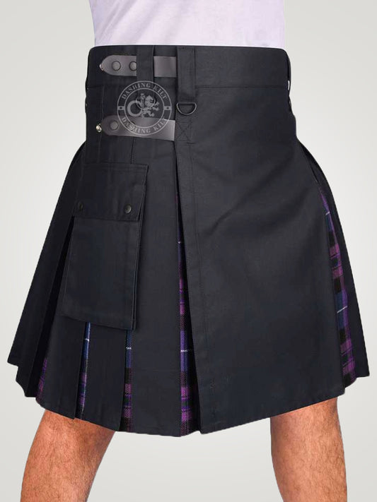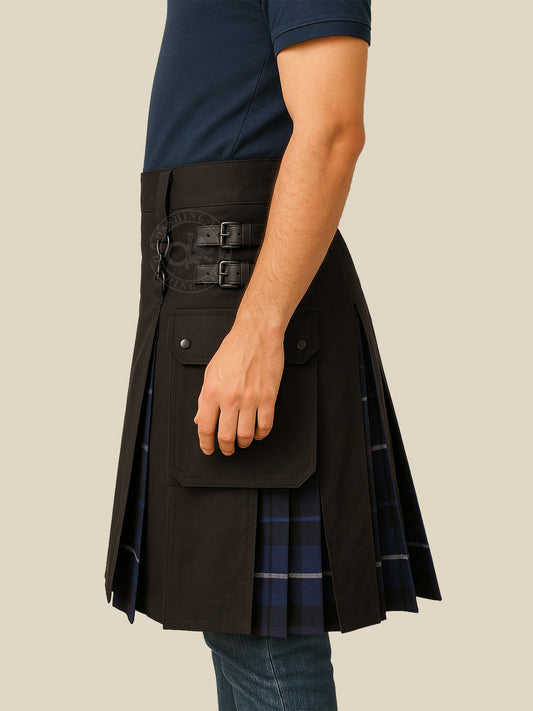Hybrid Black Cotton & Pride of Scotland Tartan Utility Kilt For Men With Leather Strap