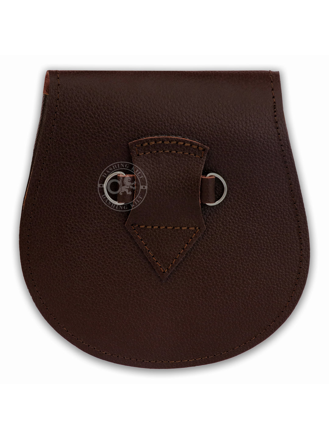 Expertly handmade from 100% genuine brown cow leather, this day sporran features rust-resistant hardware and a leather chain belt for secure closure. Included are a free leather belt and chromed chain. The design showcases three matching leather tassels and a chromed thistle badge, combining traditional craftsmanship with lasting durability. Constructed with non-magnetic, rust-free metal, the sporran measures 7” wide by 7.5” long and fits waists up to 50”; extensions are available for larger sizes. A distinguished accessory for men’s kilts, blending quality and style.
