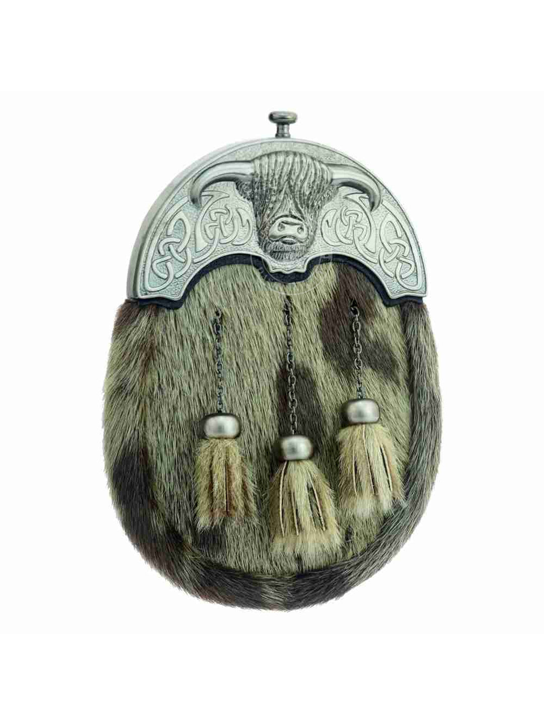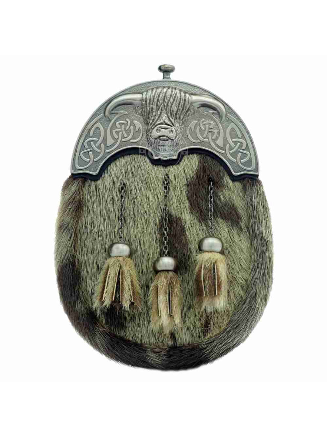 Full Dress Antique Scottish Cow Design Cantle Brown Seal Fur with Three Matching Tassels